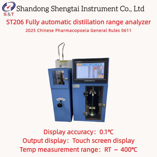The ST206 fully automatic distillation range analyzer features a color LCD display screen, Chinese menu human-machine dialogue, guided operation, and fully automated measurement process. Designed in accordance with the requirements of the 2025 Chinese Pharmacopoeia General Rule 0611 Distillation Range Determination Method, distillation range refers to the temperature range of a liquid distilled according to the following method, calibrated to standard atmospheric pressure [101.3kPa (760mmHg)], from the start of distillation of the fifth drop until only 3-4ml or a certain proportion of the volume of the test sample is distilled.